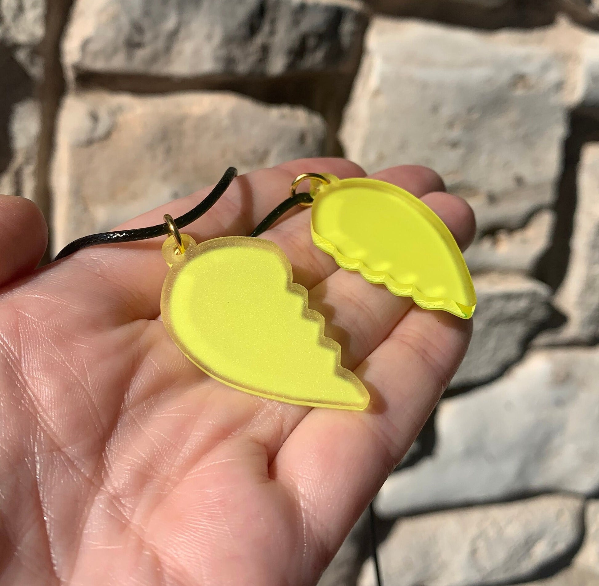 This adorable bestie jewelry pair is printed on yellow frosted acrylic charms with a glossy finish. They hang from a 18-inch gold-plated chain with lobster clasp.